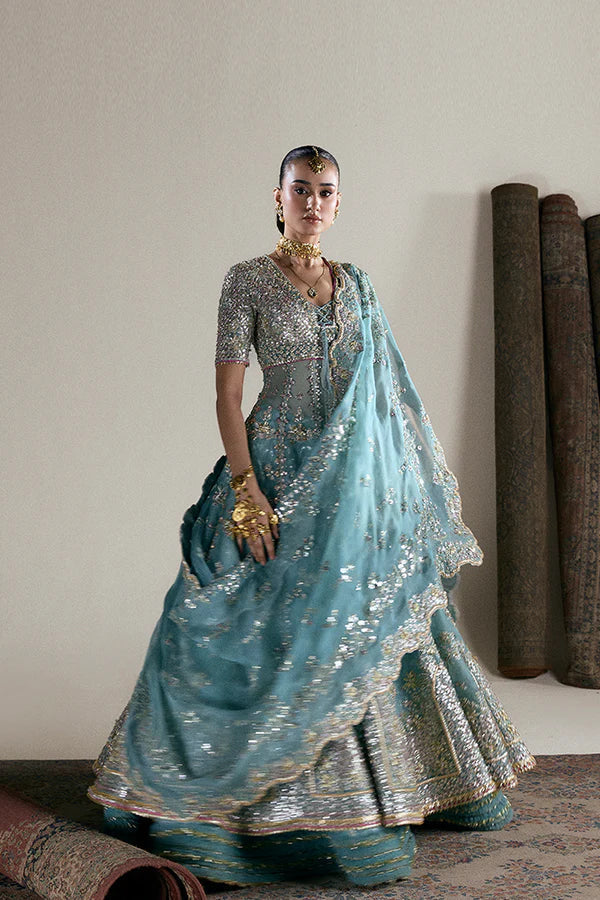 A breathtaking symphony of elegance, Anaira is crafted in serene aqua tones with delicate handwork that glimmers softly under the light. The flowing silhouette, adorned with intricate embellishments and a beautifully scalloped dupatta, makes it a timeless choice for the modern bride who loves tradition with a touch of ethereal charm.