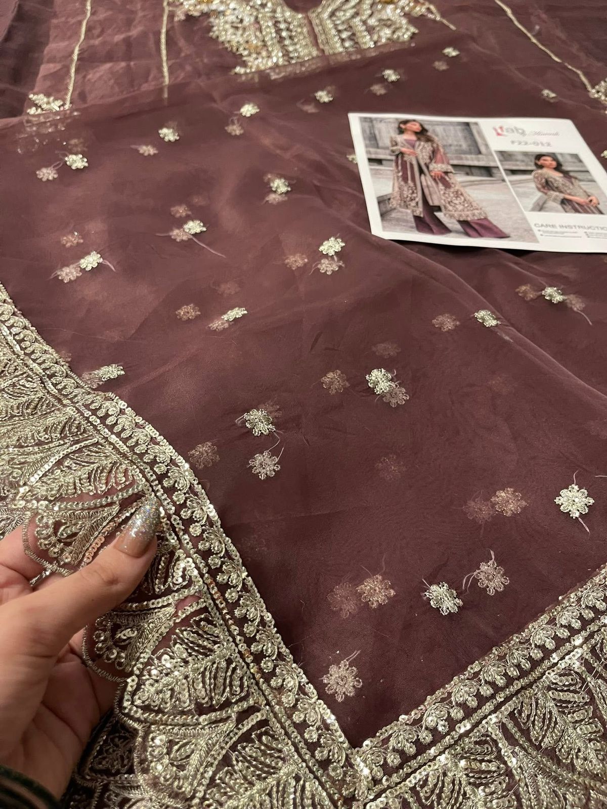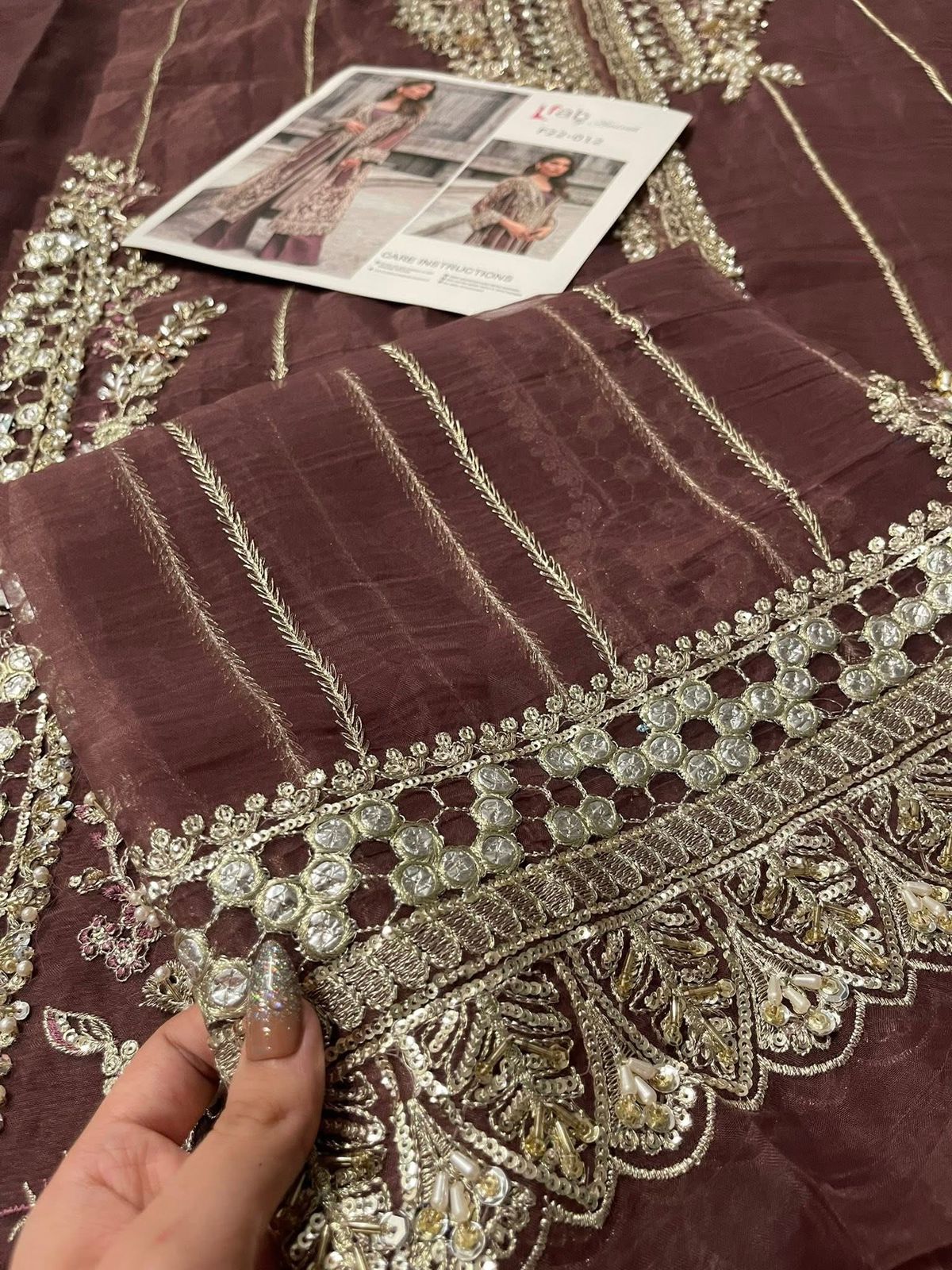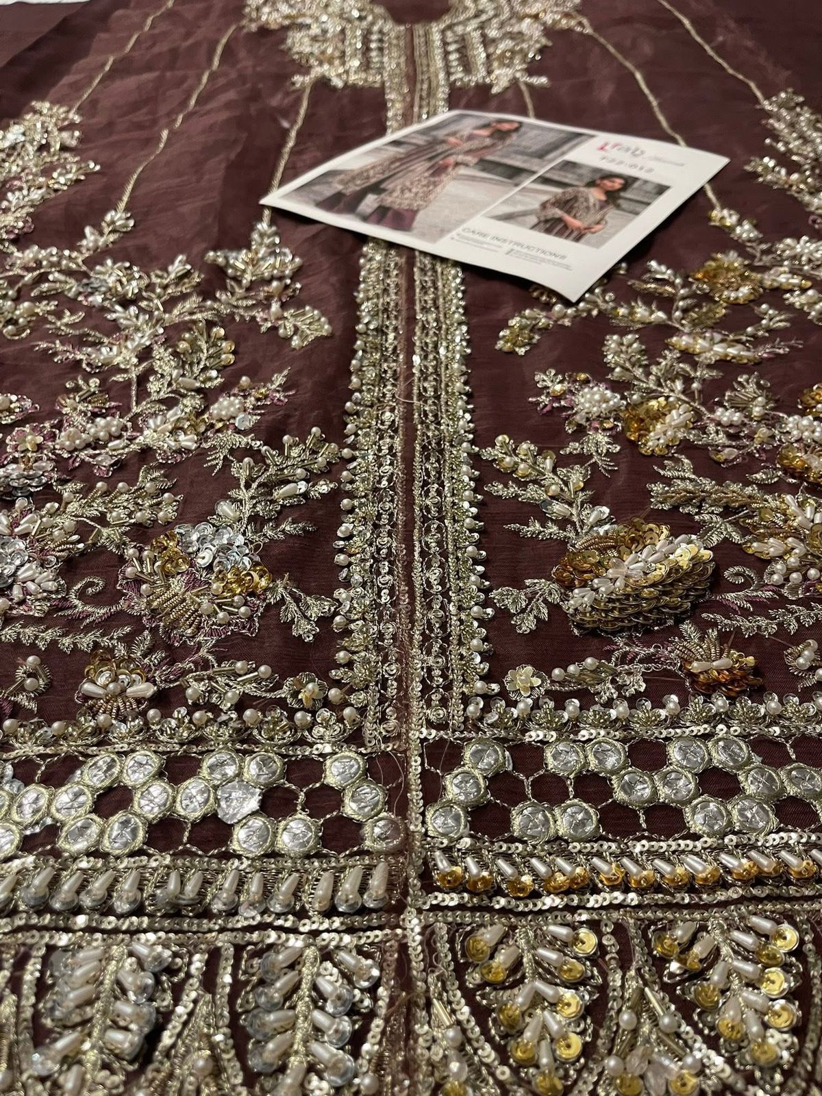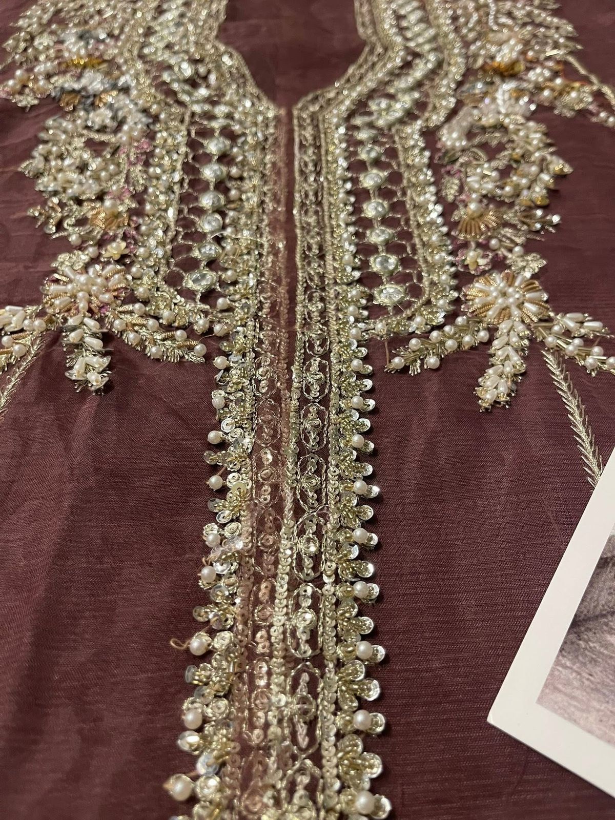 This brown outfit is sure to win praise from any room you walk into wearing it. Naqshi, stonework, dabka, pearls, and cut dana are set to embellish and enhance the beauty of this organza shirt. A flared raw silk trousers and accompanying slip elevate this dress to the next level.