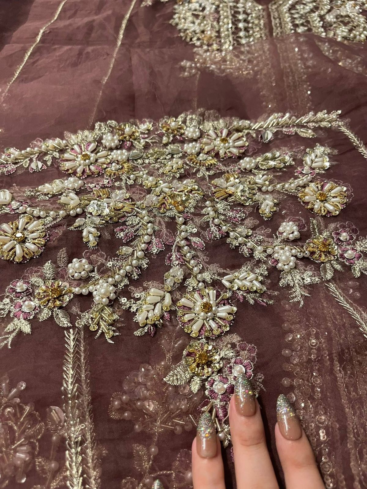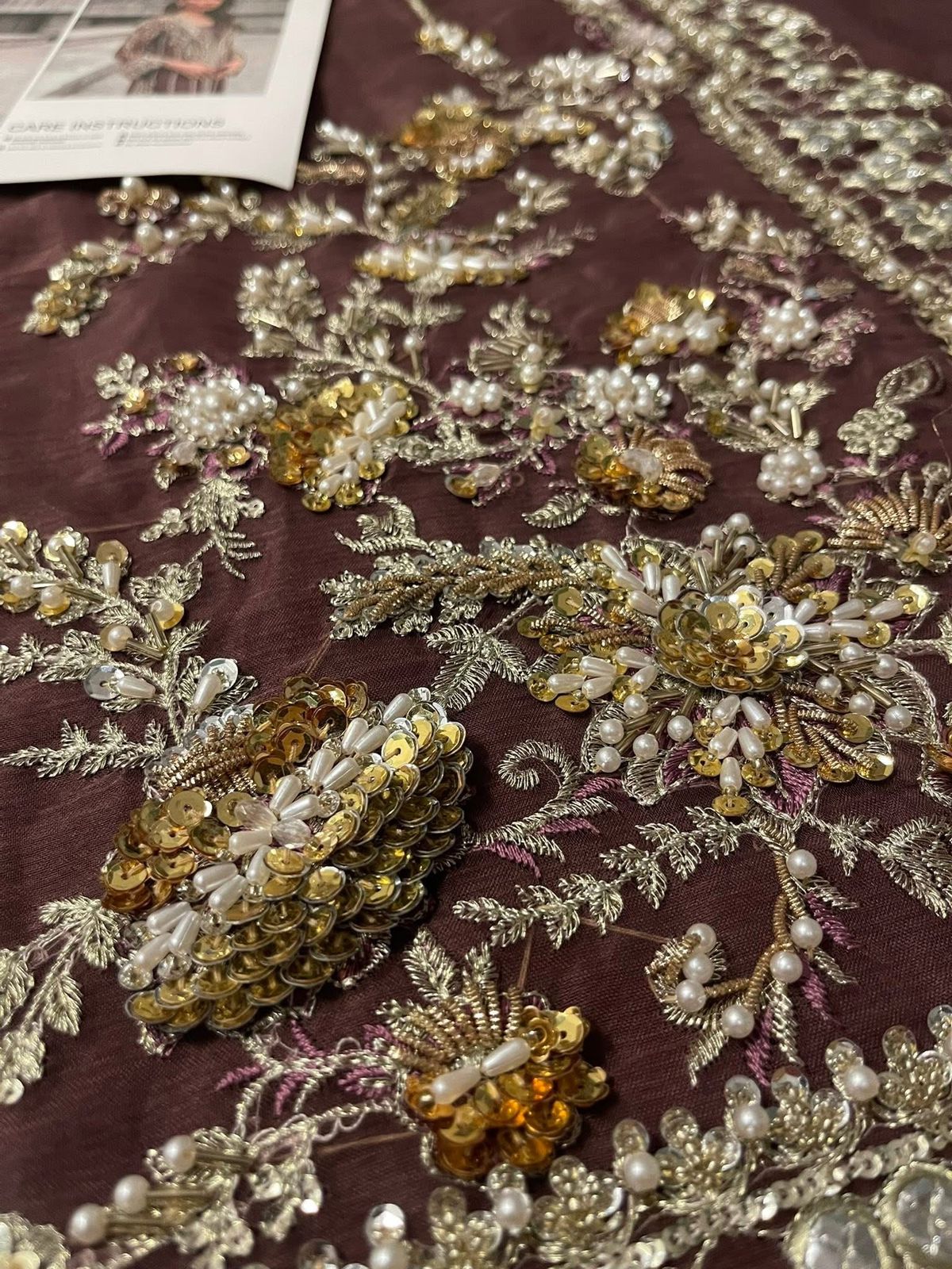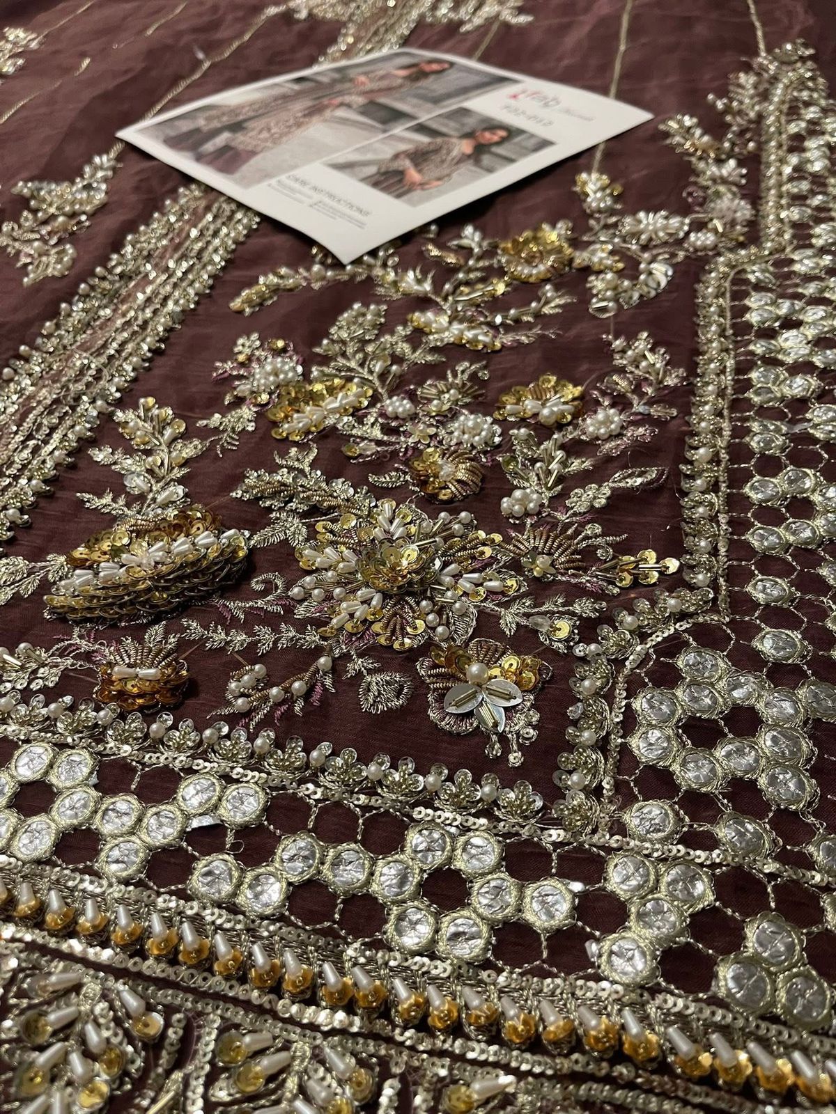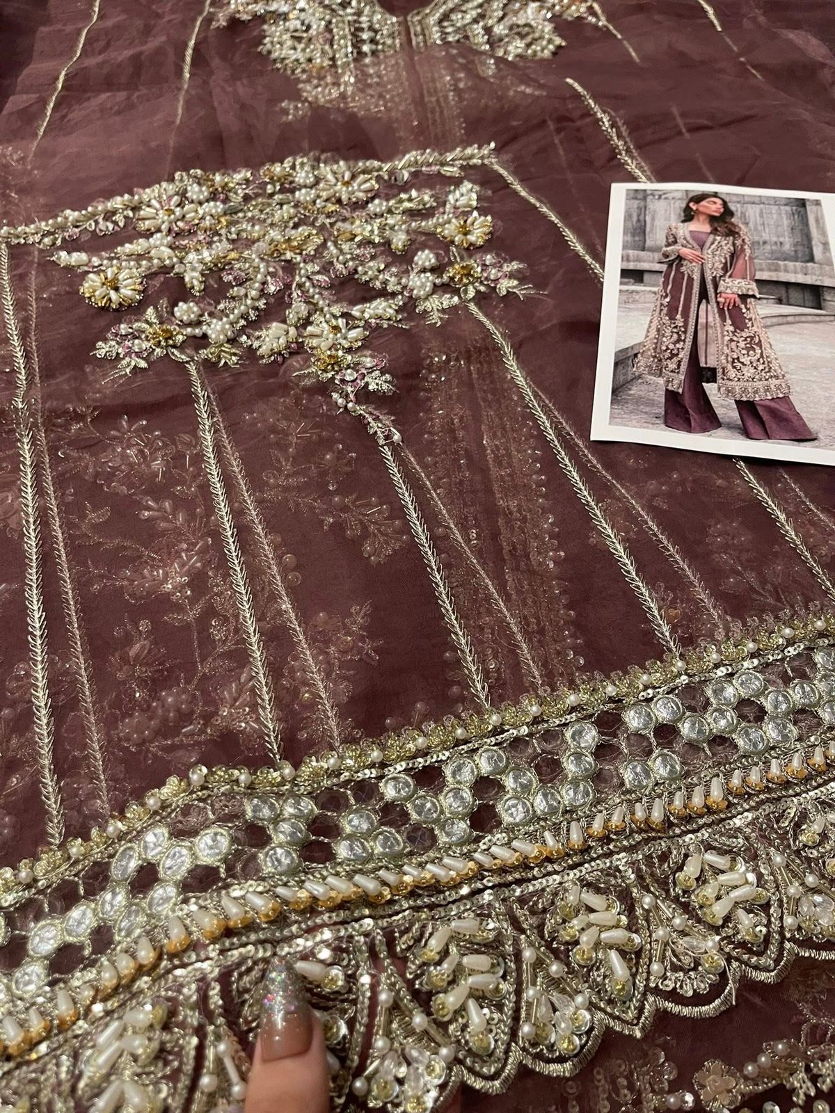 This brown outfit is sure to win praise from any room you walk into wearing it. Naqshi, stonework, dabka, pearls, and cut dana are set to embellish and enhance the beauty of this organza shirt. A flared raw silk trousers and accompanying slip elevate this dress to the next level.