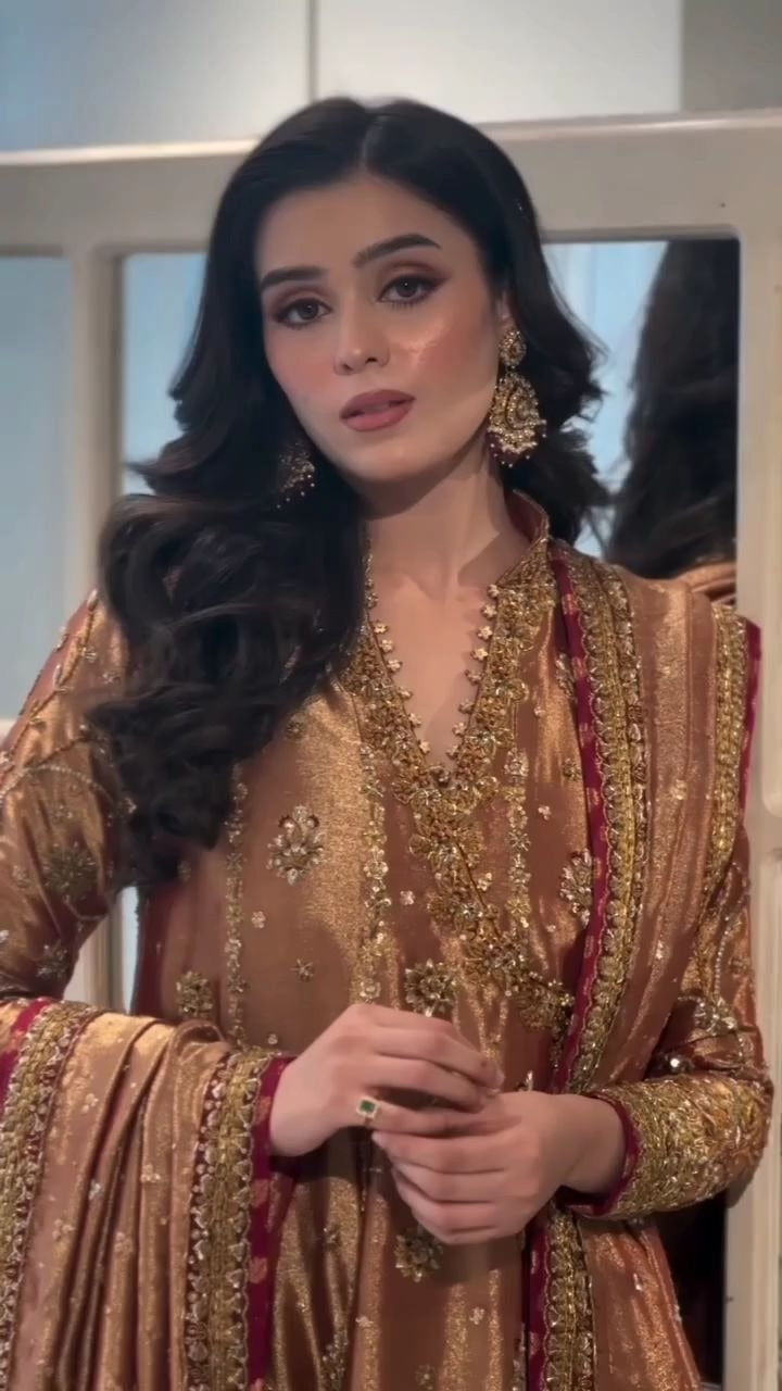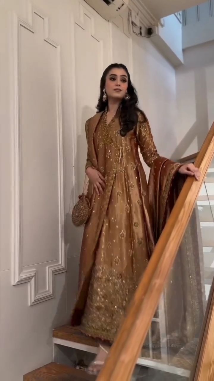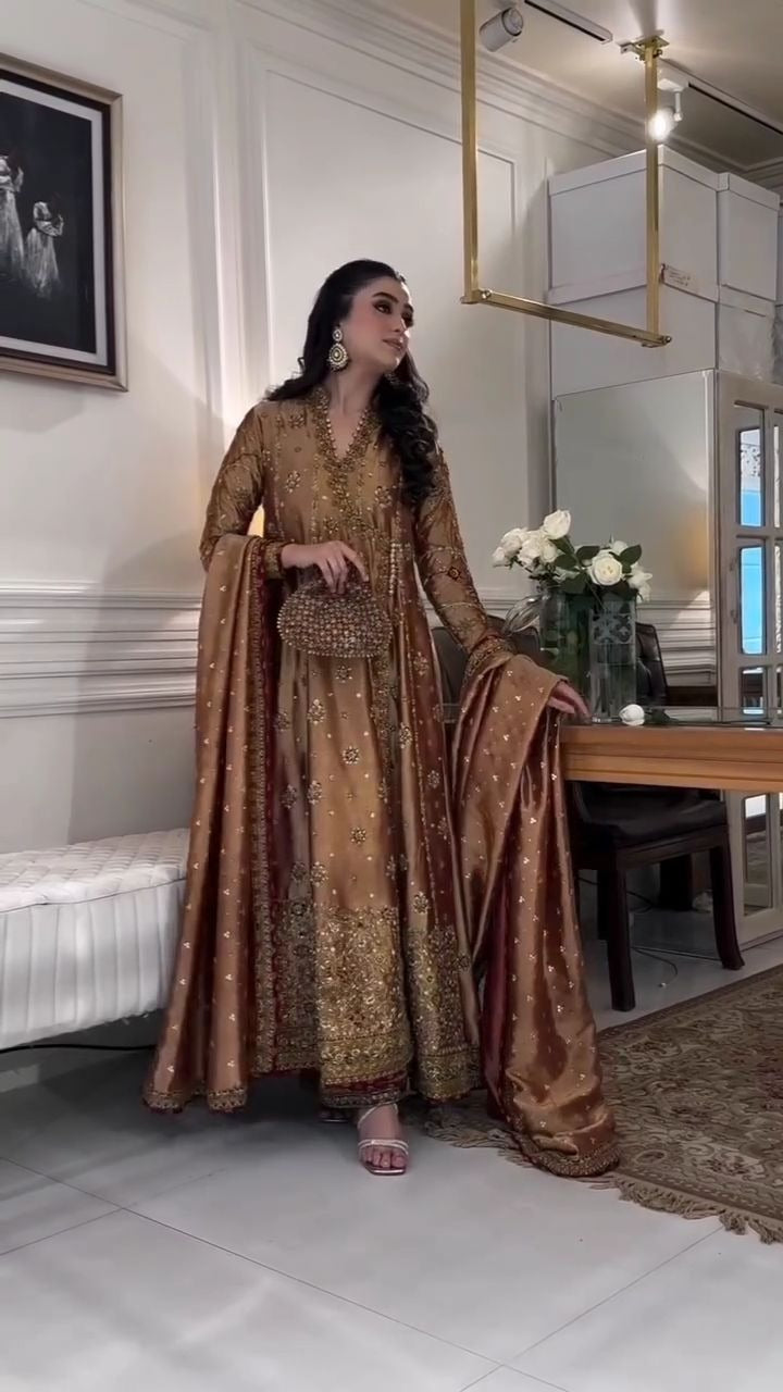 - Fully hand embellished copper gold color tissue angrakha, trousers and dupatta