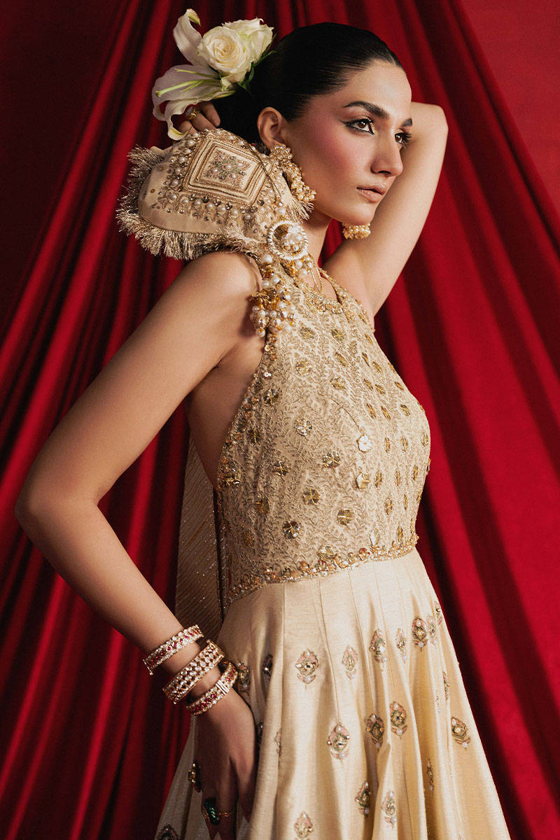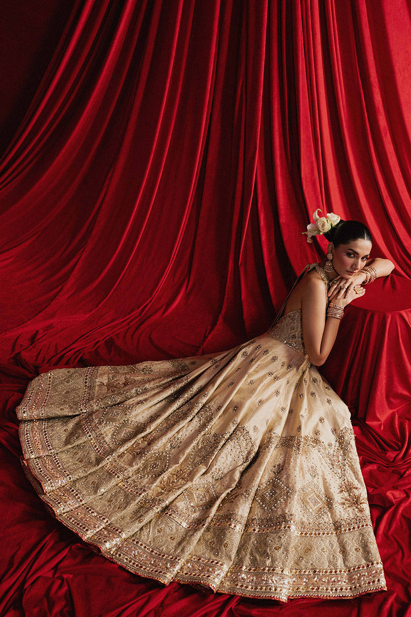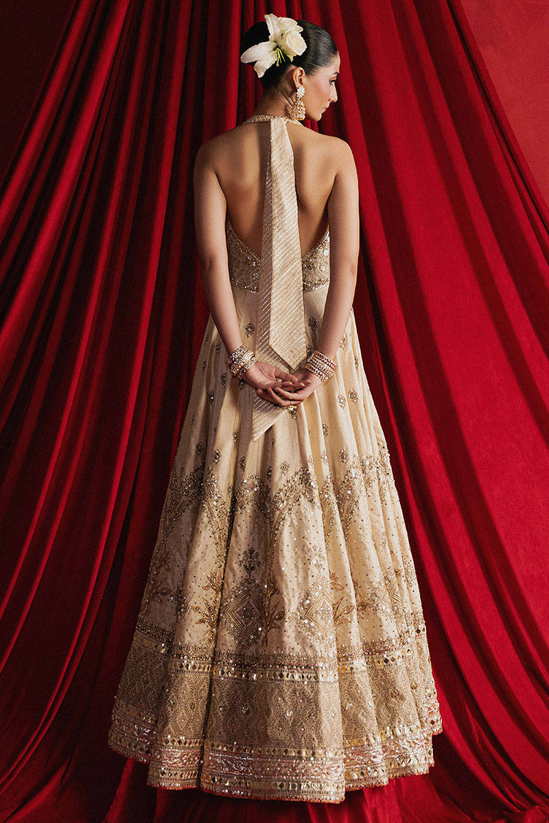 Mahjabeen is soft, white, and crafted in cream Indian silk, the ensemble is steeped in old-world techniques: silk appliqués, block print, adda embroidery, and glimmering mirror work. The choli is cut in a halter style, accentuated by Mughal jaali patterns in threadwork that enclose delicate gota patti florets like latticework backlit by sunrise. The panelled lehenga begins with a gentle spray of ascending Mughal motifs stitched in thread, building into wave-like chevrons, and ending in an explosion of large floral motifs reminiscent of miniature garden murals. These are all bordered with wide bands of embroidery, mirror work, and hand-done Mughal jaali inspired designs. The organza dupatta is an artwork in itself, featuring chevrons in sequins on both ends, scattered Mughal florals, and four glistening borders in gota and adda, each edge finished in soft golden kiran