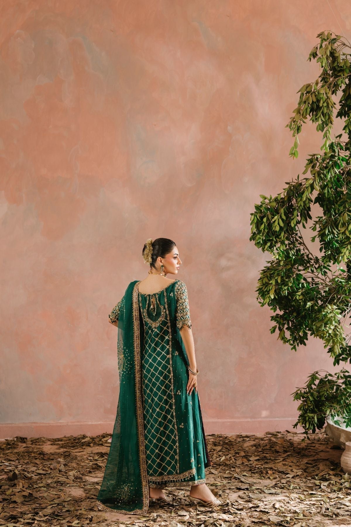A traditional outfit perfect for a royal event consisting of a pure sheeshsa silk shirt heavily embellished with intricate zardozi work and paired with a heavy dopatta with heavy embellishment and pants that are also embellished with the same technique.