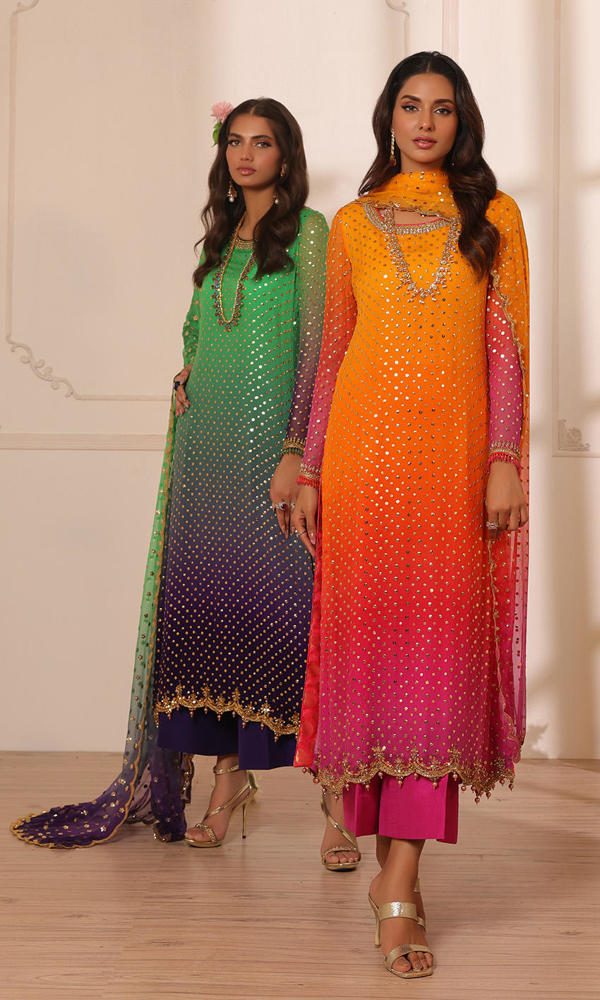 Signature gold mukesh work on a shaded based with kundan and crystal detailing on the neckline, sleeves and hem. Paired with a scalloped sequins chiffon dupatta and straight raw silk pants