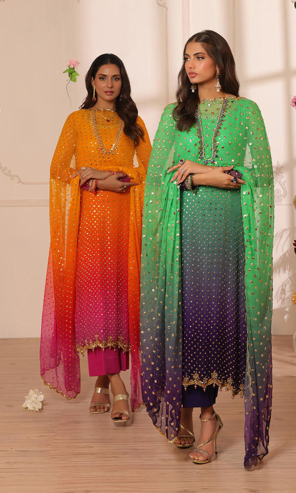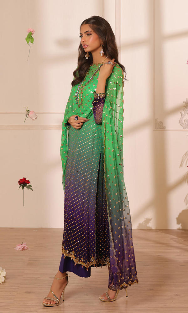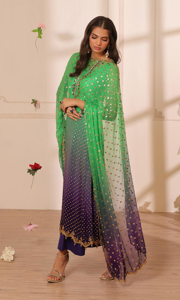 Signature gold mukesh work on a shaded based with kundan and crystal detailing on the neckline, sleeves and hem. Paired with a scalloped sequins chiffon dupatta and straight raw silk pants
