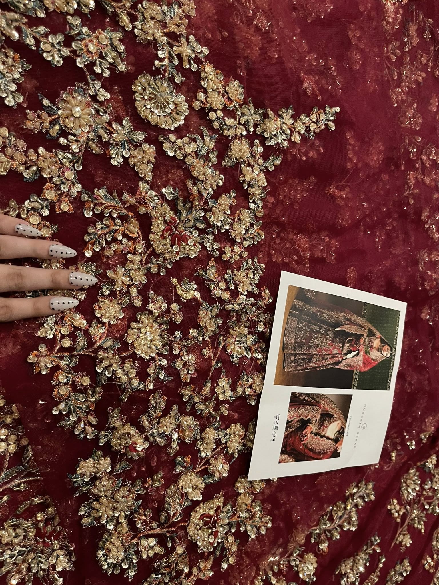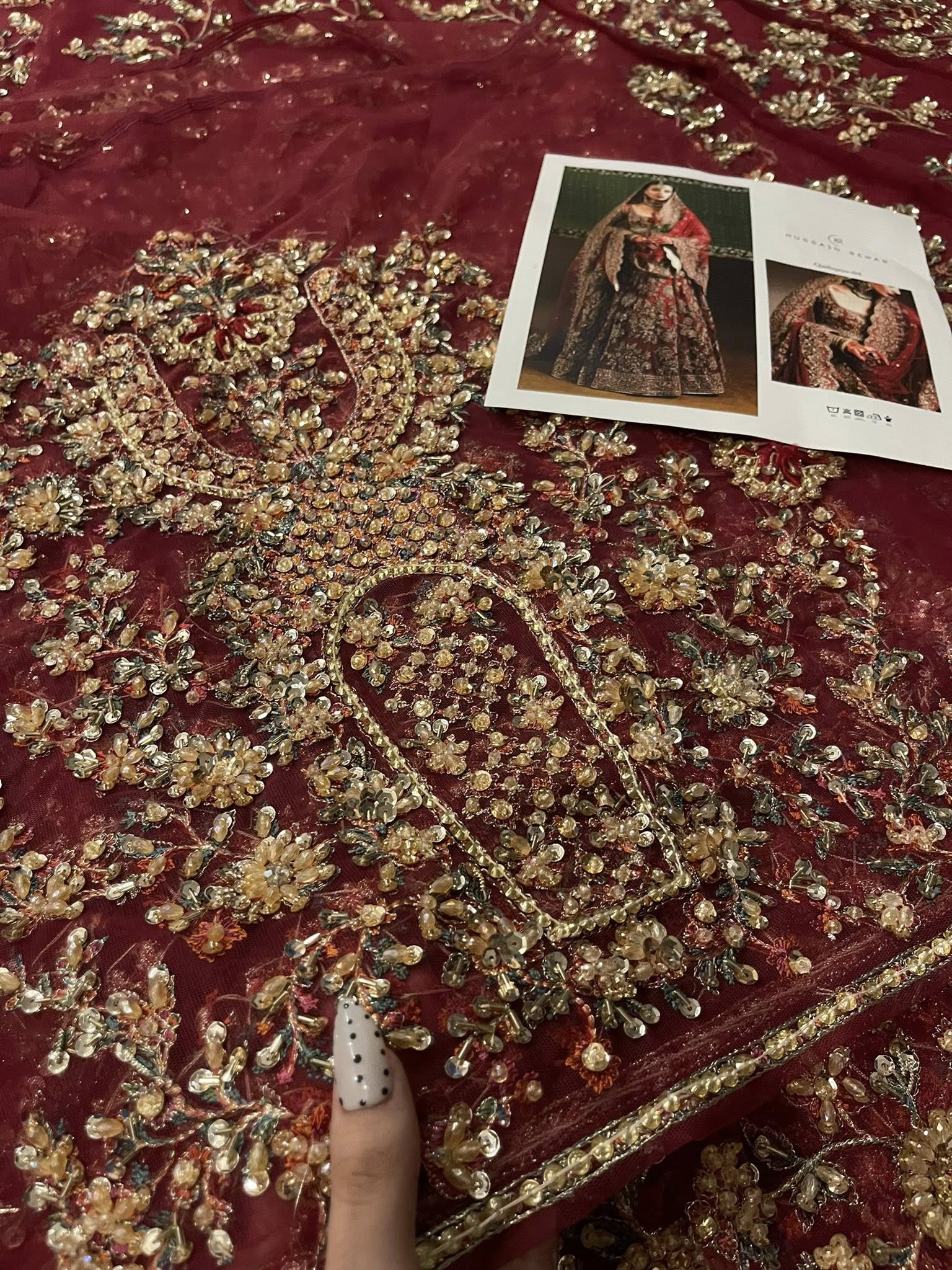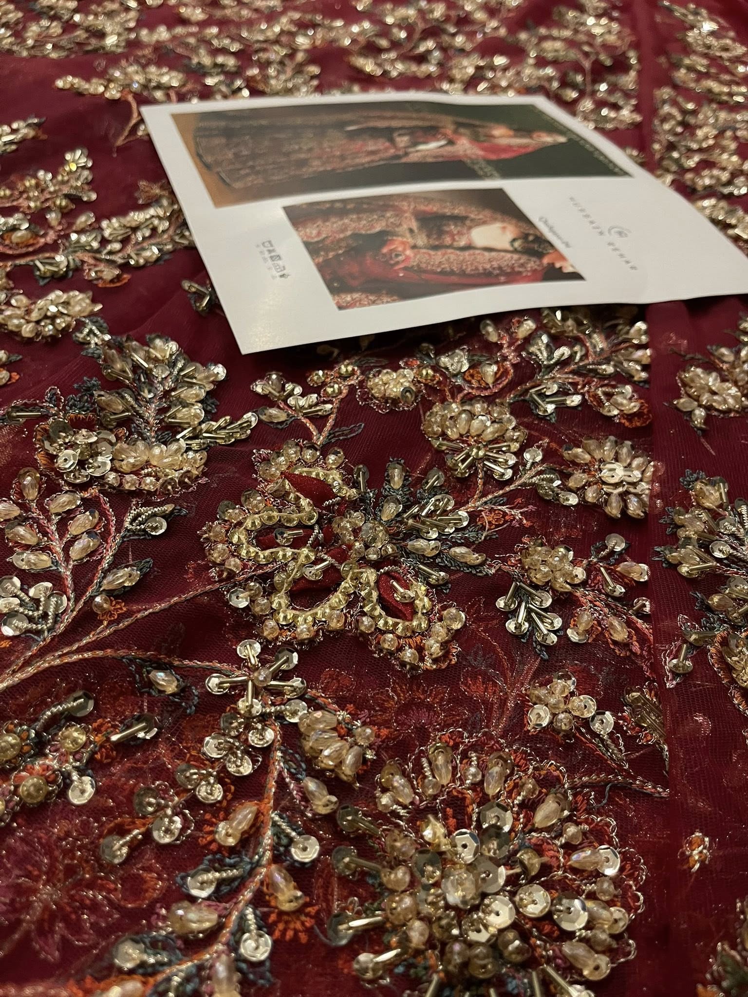 Make a bold statement with our exquisite rubby woo full-sleeve pishwaz, intricately hand-embellished with gotta tilla, cut dana, and other luxurious materials. Featuring a stunning deep neckline and opulent gold finishings, this piece radiates sophistication and allure. Paired with a lavish dupatta that showcases soft pink hues in its delicate hand embellishments, the heavy borders add an extra layer of intrigue that combines tradition and modern elegance.