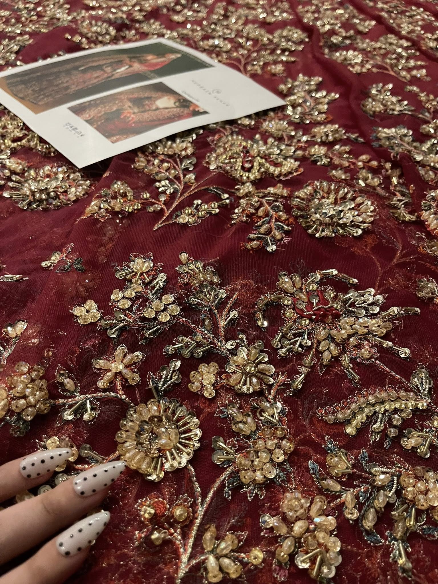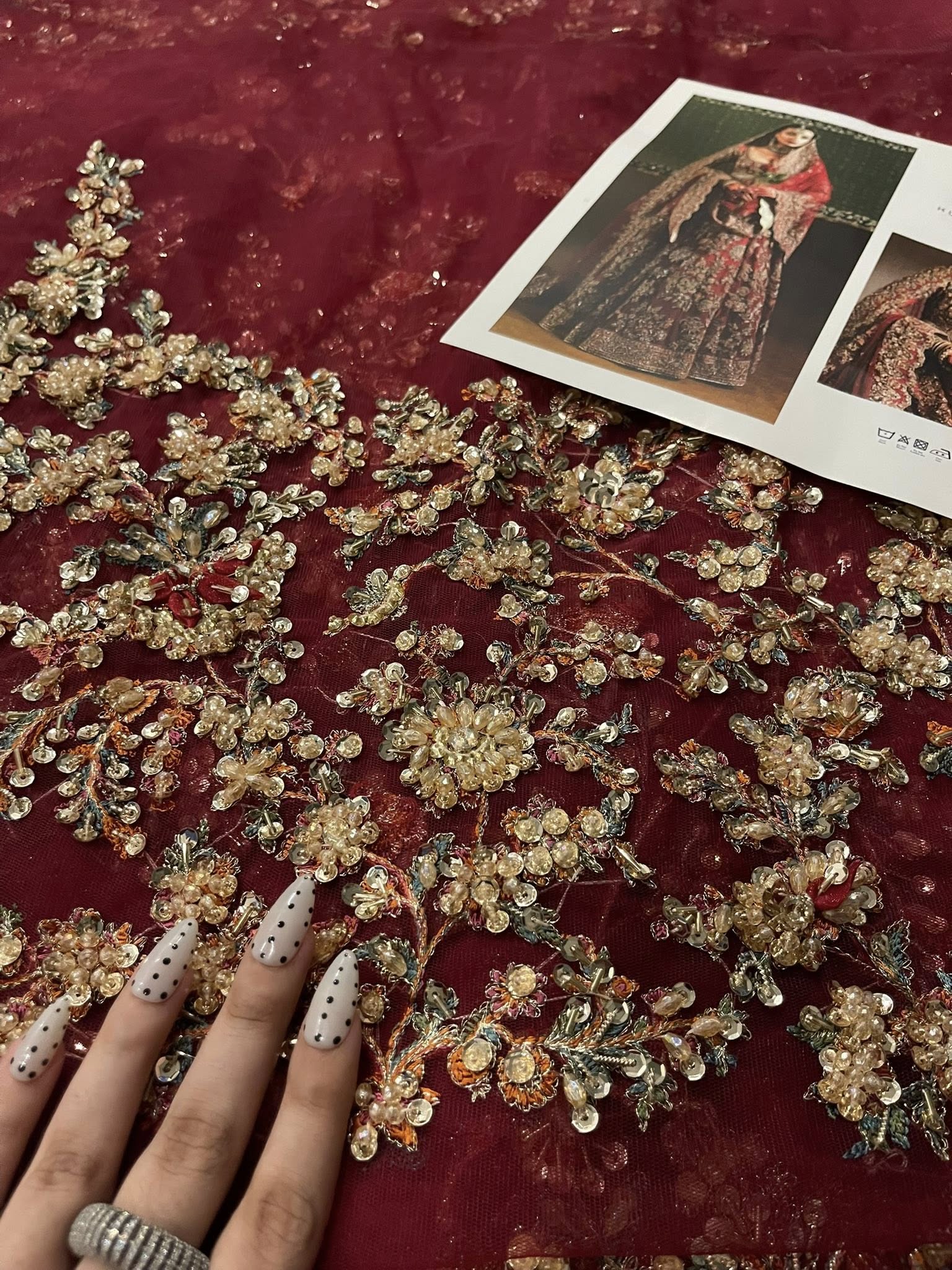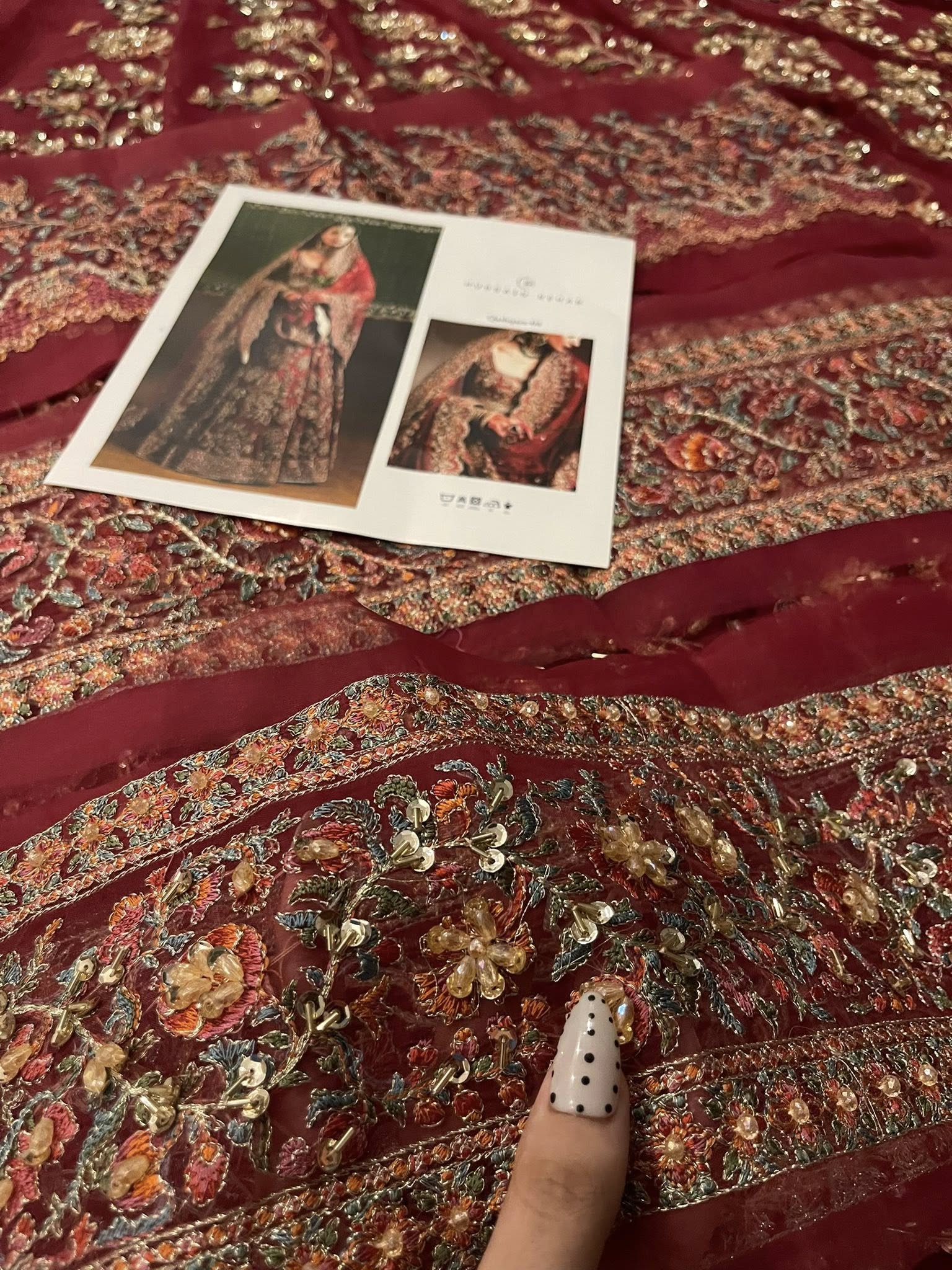 Make a bold statement with our exquisite rubby woo full-sleeve pishwaz, intricately hand-embellished with gotta tilla, cut dana, and other luxurious materials. Featuring a stunning deep neckline and opulent gold finishings, this piece radiates sophistication and allure. Paired with a lavish dupatta that showcases soft pink hues in its delicate hand embellishments, the heavy borders add an extra layer of intrigue that combines tradition and modern elegance.