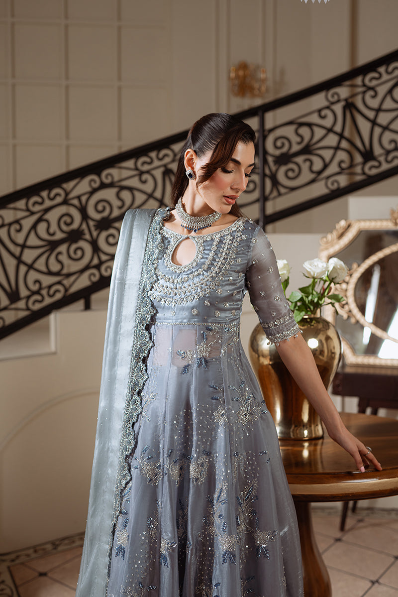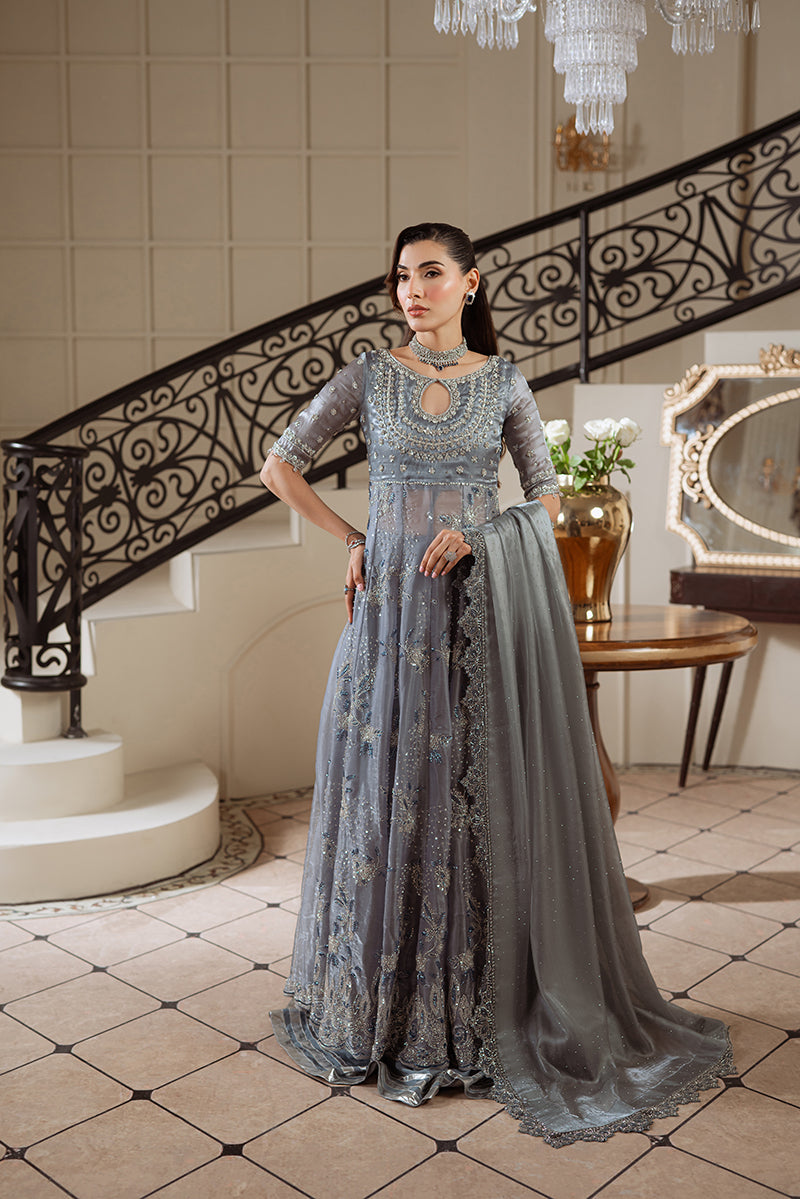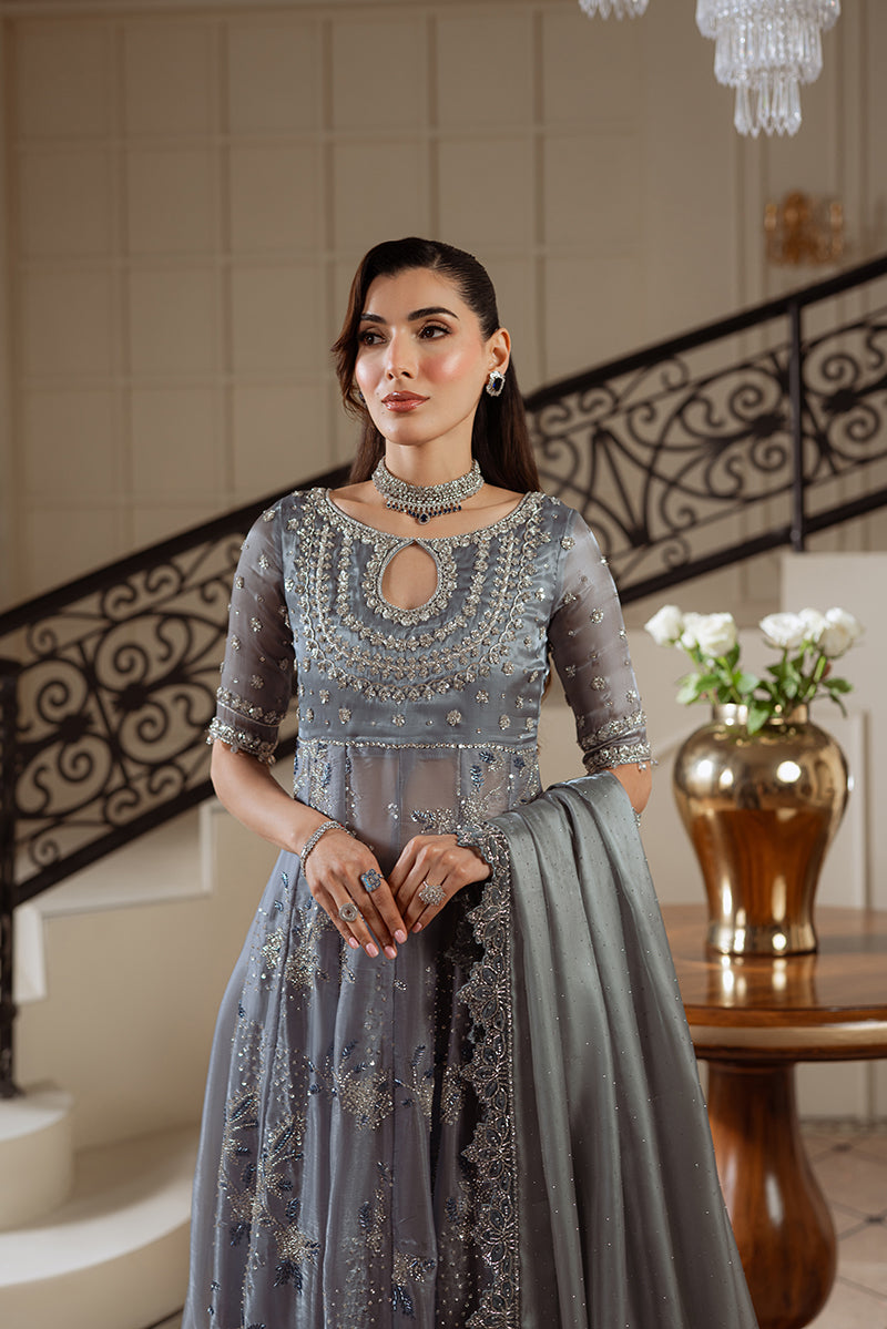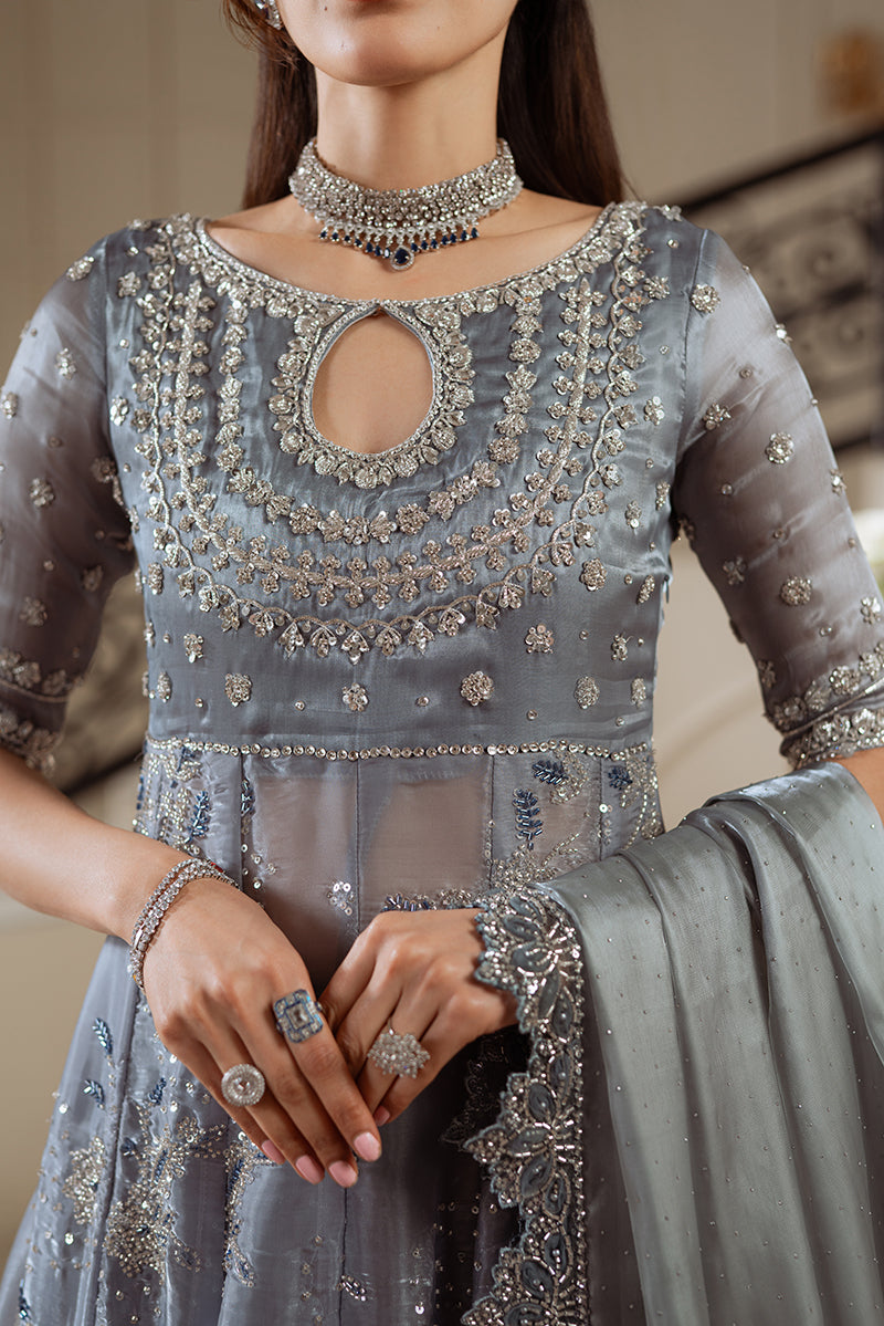 This grey gown reflects the elegance of Queen Rania, often seen in this serene hue. Crafted from organza silk, the gown features hand-embellished zardozi, katdana, and sequins with button detailing. The long, flowy design is paired with raw silk flared sharara pants, adorned with silver zardozi work. A handmade dupatta with stone-crafted flowers adds a final touch of sparkle, making this ensemble a perfect blend of royal grace and intricate craftsmanship.