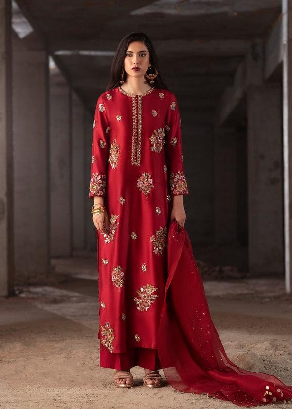 This deep red ensemble radiates timeless elegance with its rich color and intricate embellishments. The long shirt features hand-embellished floral motifs and detailed work along the neckline and cuffs, paired with straight trousers and a flowy organza dupatta. A bold yet classic choice for festive evenings or formal gatherings.